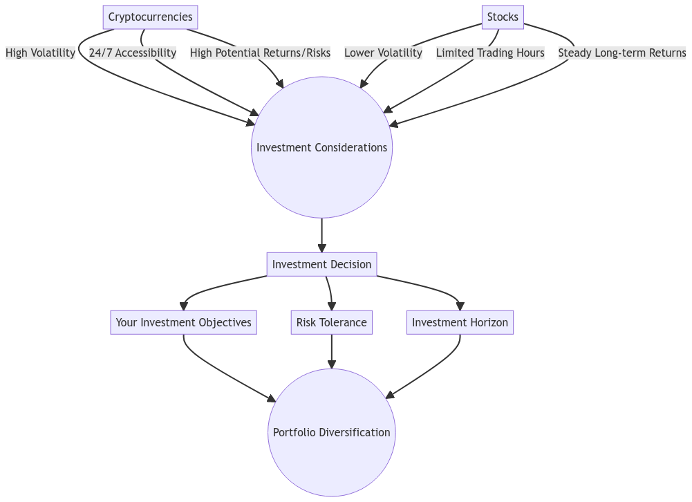The decision to invest in stocks or cryptocurrencies should be anchored in your investment objectives, risk tolerance, and investment horizon. Diversification of your portfolio is vital for risk mitigation and achieving a balanced return on investment.
